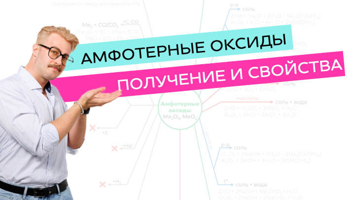 Покорители химии, сегодня мы продолжим изучение оксидов. На этот раз мы поговорим про амфотерные оксиды! Напомним, что амфотерные оксиды образованы металлами со степенью окисления +3 или +4 (Al2O3, Cr2O3). А в прошлой статье мы обсудили основные оксиды [читать]. В этой статье рассмотрим получение и химические свойства амфотерных. Приятного прочтения! 1. Окисление металлов водородов. Например, в реакции алюминия с кислородом образуется оксид алюминия (III). Важно напомнить, что в реакции железа с кислородом при температуре 150-500 градусов Цельсия образуется Fe3O4 (железная окалина – двойной оксид); 2. Разложение гидроксидов: все гидроксиды амфотерных металлов прекрасно разлагаются с образованием оксида и воды; 3. Обжиг сульфидов происходим с выделением оксида серы (IV): например, таким образом мы можем сжечь пирит (FeS2), образуется оксид железа (III) и тот самый SO2; 4. Разложение солей кислород содержащих кислот: например, нитраты разлагаются с образованием амфотерного оксида, N