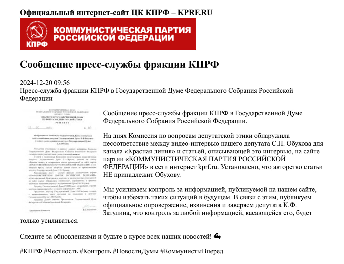 После обращения Константина Затулина в комиссию по этике Государственной Думы, наши коллеги из КПРФ обнаружили, что опубликованный на их же сайте текст не имеет ничего общего с реальными словами их же депутата.