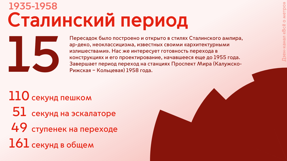 Пусть период длился и после смерти Сталина, это его наследие, если так можно сказать. Создавали "дворцы для народа" и это отражалось не только на визуальном облике, но и на конструкциях станций и пересадок. Именно поэтому сюда вошла станция "Проспект Мира", открытая через 3 года после того самого постановления.
