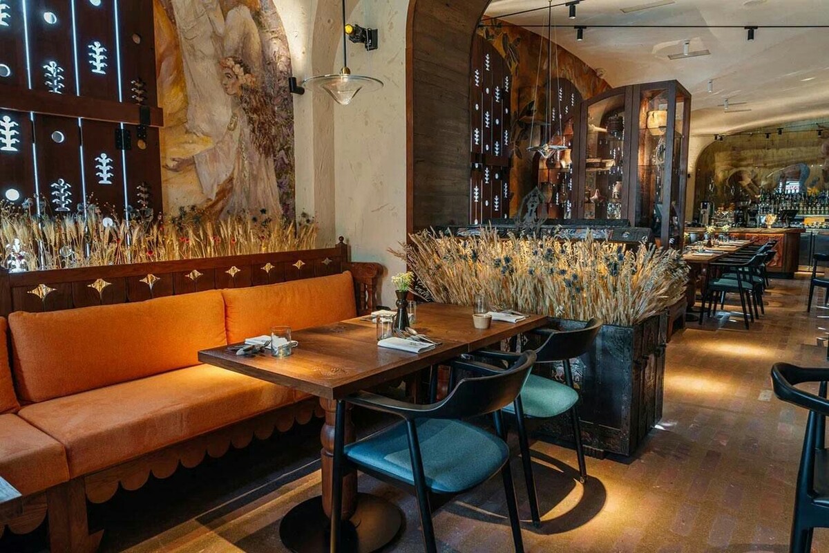 Ресторан наполнен отсылками к мифам, былинам и легендам о создании хлеба, а центральным элементом стала традиционная русская печь с изразцами и изображением богатыря~хлебопашца Микулы Селяновича. Если приглядеться, можно заметить, что даже фактура штукатурки на стенах отсылает посетителей к созданию хлеба ~ она напоминает мятое пальцами тесто.
