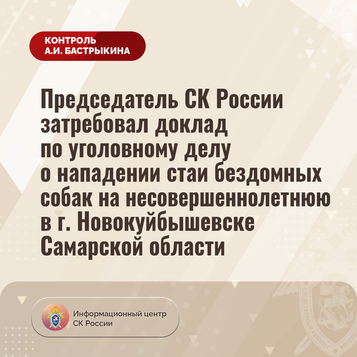 Председатель СК России затребовал доклад по уголовному делу о нападении стаи бездомных собак на несовершеннолетнюю в г. Новокуйбышевске Самарской области В СМИ и социальной сети сообщается, что 19 января текущего года вблизи дошкольного учреждения в городе Новокуйбышевске Самарской области стая безнадзорных собак набросилась на школьницу, укусив за ноги. Пострадавшей потребовалась медицинская помощь. Отмечается, что несмотря на неоднократные обращения местных жителей, мер к организации отлова агрессивных животных не принимается. В региональном следственном управлении по данному факту возбуждено уголовное дело. Председатель Следственного комитета Российской Федерации Александр Иванович Бастрыкин затребовал у и.о. руководителя СУ СК России по Самарской области Александра Владимировича Воеводина доклад об установленных в ходе проведенных следственных действий обстоятельствах, а по завершении расследования уголовного дела – о его результатах. Исполнение поручения поставлено на контроль в ц