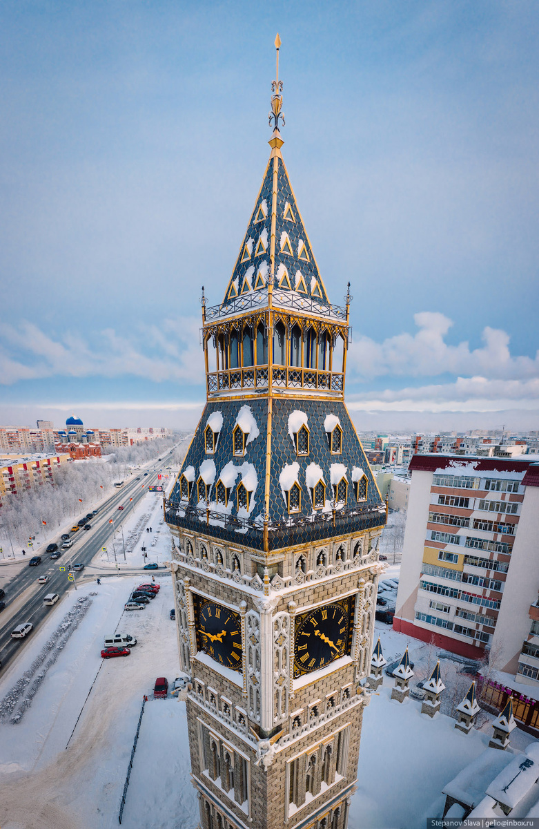 Башня на улице Островского – учебный корпус местной школы изучения иностранных языков. Очертания здания напоминают Вестминстерский дворец в Лондоне, в котором проходят заседания британского парламента. На башне красуются куранты, изготовленные в Великобритании. Лицевую сторону механизма мастера покрыли настоящим сусальным золотом, а циферблат копирует английский оригинал, хоть и в три раза меньше.