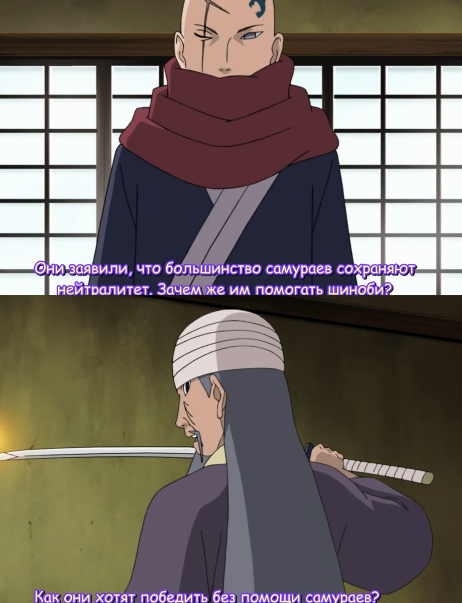 Что ж, конечно, у Мифуне своя идеология, которая раскроется чуть лучше в течение этой серии - а если вкратце, то он верит в МИР, истинный и беспрекословный, и видимо поэтому чувствует необходимость участия в Четвёртой Мировой, ОДНАКО, эта фраза со скрина ниже меня забавит: "Как они хотят победить без помощи самураев?". Будем честны, но самураи не сделали НИЧЕГО, кроме того, что являлись физической разменной силой, естественными противниками для кого были только Белые Зетсу. Конечно, с этой точки зрения и обычные СТАТИСТЫ не вносили никакого значения в результат боя, НО! Если у шиноби ну ОЧЕНЬ много "главных побочных героев", которые вносят весомый импакт в поле боя, то у самураев нет никого, кроме того же Мифуне, и то, единственную свою роль он сыграет здесь, в бою с Ханзо, и я думаю, что с Ханзо могли бы справиться и иные представители мира шиноби, за исключением того момента, что у Ханзо и Мифуне оказывается есть общая история, которая для нас, как для зрителя - новый "роль я в кустах", а поэтому, с таким же успехом могли придумать грустную историю для Тентен и Ханзо Саламандра, как он убил её родителей (ну, а где они?), как она, годовалым ребёнком ползала и игралась с его серпом с цепью... и ничего бы не поменялось!