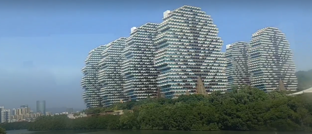 👉 в него входят девять 31-этажных небоскребов, построенных в форме яблоневых деревьев. Такая форма была выбрана не случайно - она символизирует экологию Хайнаня, который славится своим чистым тропическим воздухом, чудесной природой и самым большим процентом долгожителей в Китае.