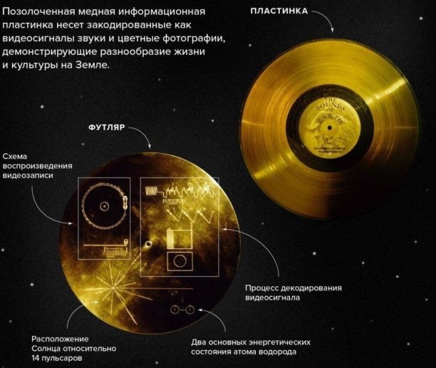 Так появилась золотая пластинка «Вояджера». На ней люди изобразили карту пульсаров, на которой помечено положение Солнца в Галактике, а также схему излучения атома водорода для получения метрических и временны́х единиц. Но пластинка была не простой. А музыкальной! Более 70% всех записей посвящено звукам Земли. Часть из них — шедевры мировой классики. А часть — звуки из простой жизни: кваканье лягушек, лай собак, плачь ребенка, стук топора о дерево. Чтобы инопланетяне разобрались, как прослушать композиции, ученые заботливо выгравировали инструкцию: как правильно поставить иглу на пластину и воспроизвести записи. С момента запуска миссии прошло 47 лет. Космические аппараты «Вояджер-1» и «Вояджер-2», на которых прикрепили пластинки, улетели на расстоянии более 23 830 940 000 км от Земли.