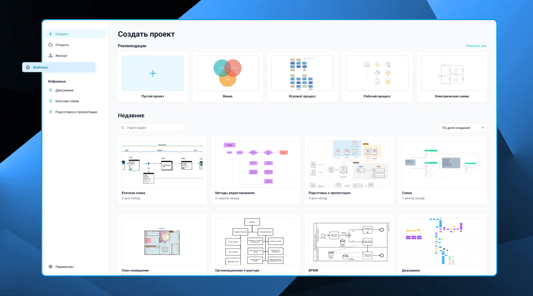 Однозначное преимущество любого современного редактора блок-схем: наличие готовых шаблонов и возможности загружать собственные шаблоны. Как правило, их применение позволяет существенно экономить время в процессе работы.