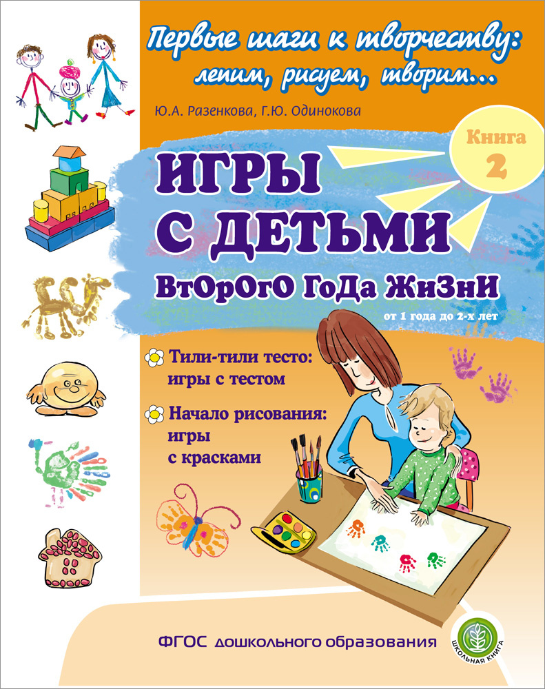 ИГРЫ С ДЕТЬМИ ВТОРОГО ГОДА ЖИЗНИ. Кн. 2: Тили-тили тесто: игры с тестом. Начало рисования: игры с красками / Под ред. Ю.А. Разенковой. — М.: Школьная Книга, 2022. — 64 с.: ч/б илл. (Серия «Первые шаги к творчеству: лепим, рисуем, творим...») ISBN 978-5-00013-245-6 Книга посвящена истокам творчества ребёнка второго года жизни (от 1 года до 2 лет). В ней собраны интересные и доступные для его возможностей игры, которые помогут родителям, взрослым сопровождать и поддерживать процесс развития своего малыша. Важная особенность содержащихся в книге игр — участие в них не только взрослых, родителей, но и хорошо знакомых малышу игрушек: зайки, мишки, куклы, машинки, которым кроха с удовольствием показывает своё творение, рассказывает о нём с помощью взрослого. В процессе игры малыши получают первые представления о форме, цвете и величине предметов игрового материала, проявляют двигательную активность, развивают мелкую моторику, воображение, эмоции и делают первые шаги на пути к творчеству. Кн
