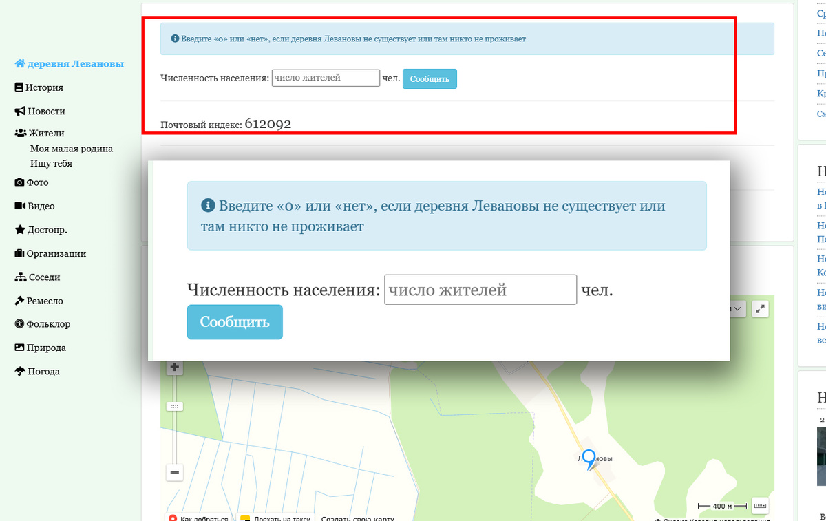 Сегодня добавили на сайт uistoka.ru информирование о несуществующем населенном пункте, теперь, если указать в графе численность населения малой родины «0» или «нет», то в данном блоке будет отображаться сообщение, что в населенном пункте никто не проживает или этого населенного пункта не существует.