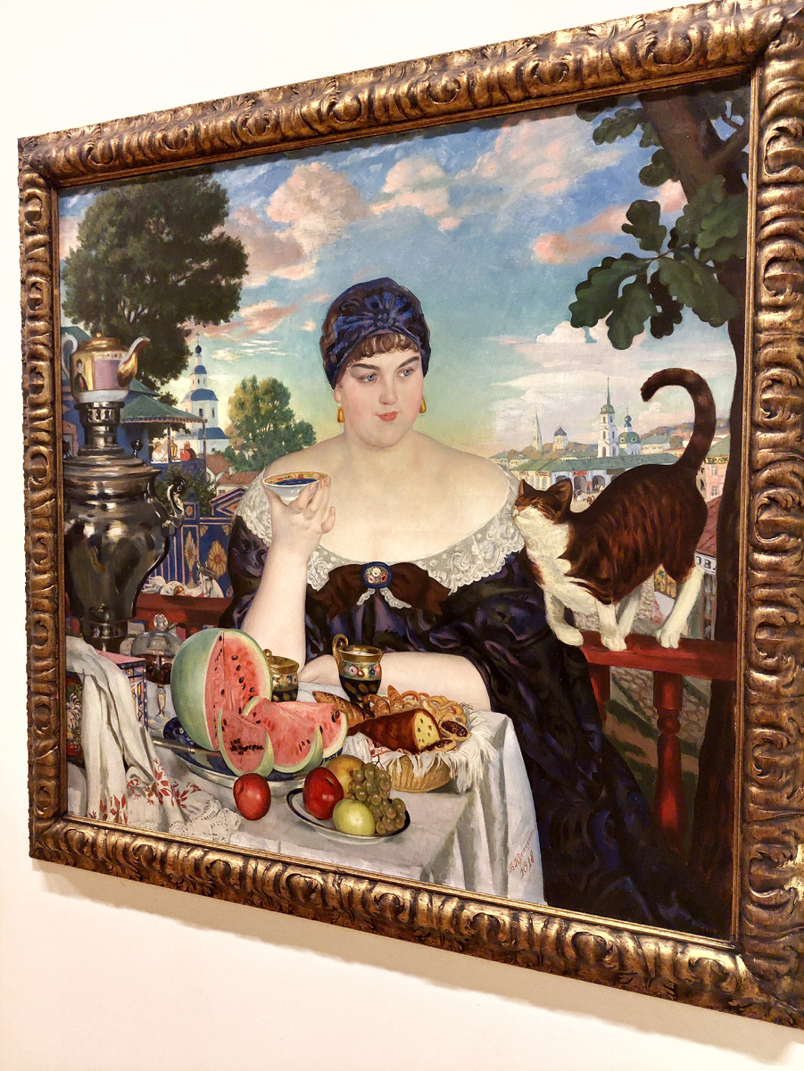 Когда говорят о популярности чая на Руси, я сразу же представляю картину Кустодиева "Купчиха за чаем". Кстати, моделью художнику послужила совсем не купчиха!