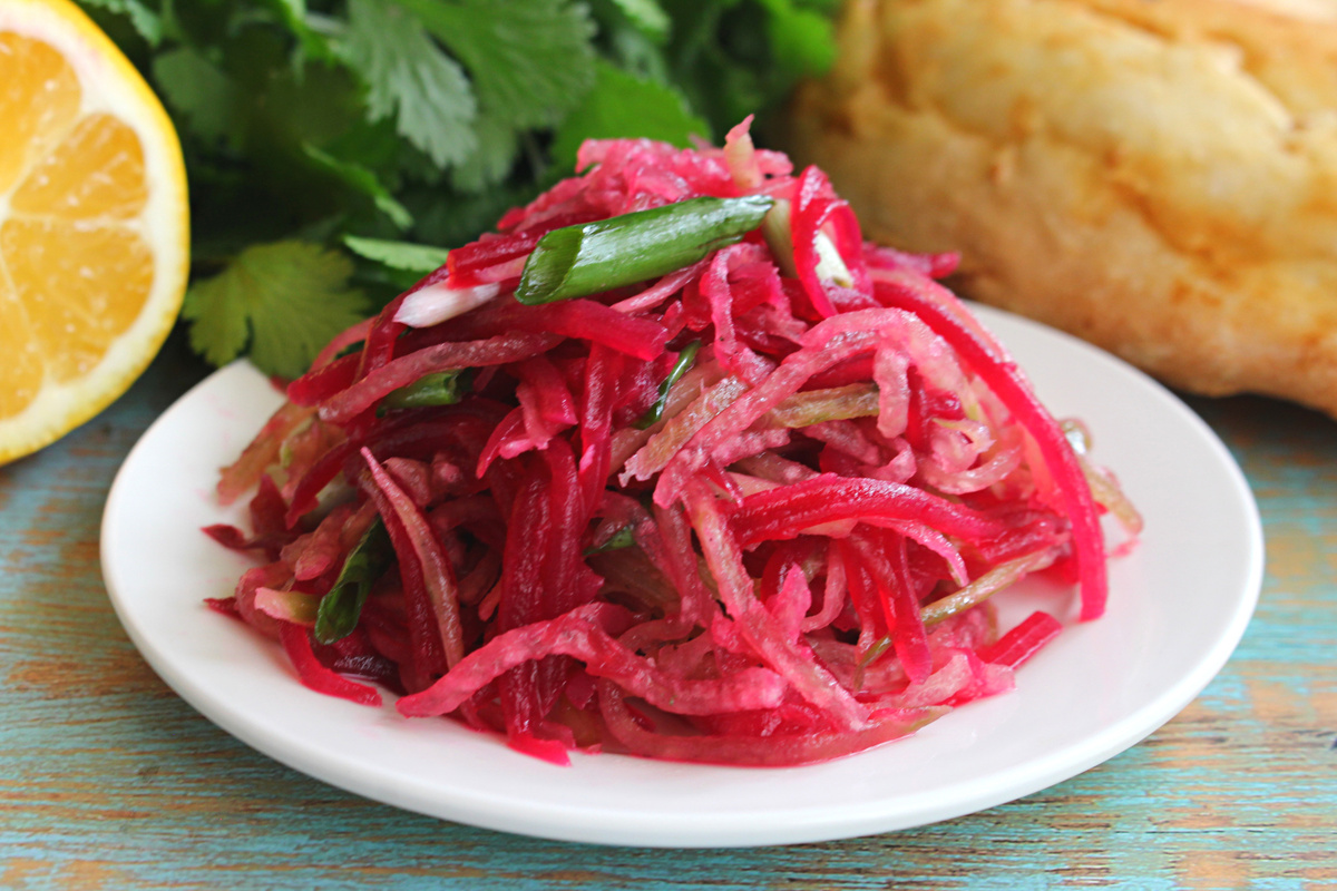 В дружественном канале встретился рецепт этого замечательного салата. В этом салате все для меня, я люблю легкие салаты, люблю свеклу, люблю салаты, заправленные маслом и лимонным соком. Сразу взялась готовить, результатом очень довольна! Салат сочный, вкусный, яркий и полезный. Суть салата в том, чтобы редька стала более нежная по вкусу. Прелесть салата - все ингредиенты на свое усмотрение. Хочется больше редьки, добавьте больше, хочется больше свеклы, делайте так. Я брала примерно равное количество свеклы и редьки. Такой салат подойдет для постящихся, вегетарианцев, худеющих и просто для любителей свекольных салатов. Свекла - 1 шт. Редька зеленая - 1 шт. Лук зеленый - 3-4 пера Сок лимонный - 1 ст.л. Масло растительное - 1 ст.л. Перец черный молотый, соль - по вкусу Первым делом нам нужно сварить или запечь свеклу, остудить и почистить. Пока свекла готовится, очищенную редьку нарежем или натрем через салатную терку тонкой соломкой. Добавим немного соли, перемешиваем и оставим на 10-15