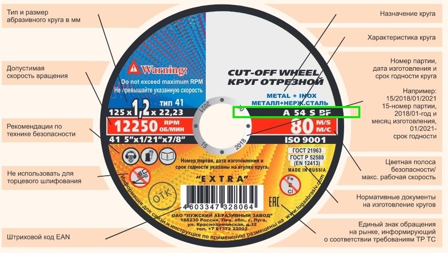 А/АS - оксид алюминия (для резки металла). АZ - электрокорунд циркониевый, (высокий ресурс и мощность резания). 46 - тип зернистости, чем больше это число, тем меньше зернистость. Например: 24 - большое, 30 - среднее, 36 - низкое. R - обозначение твёрдости круга. Чем дальше по алфавиту, тем больше твердость. Например: Q - мягкий, R - средний, V - твёрдый. ВЕ - связка из синтетической смолы, упрочненной волокнами. ТВЁРДОСТЬ 1. Описание A/AS – оксид алюминия (для резки металла).