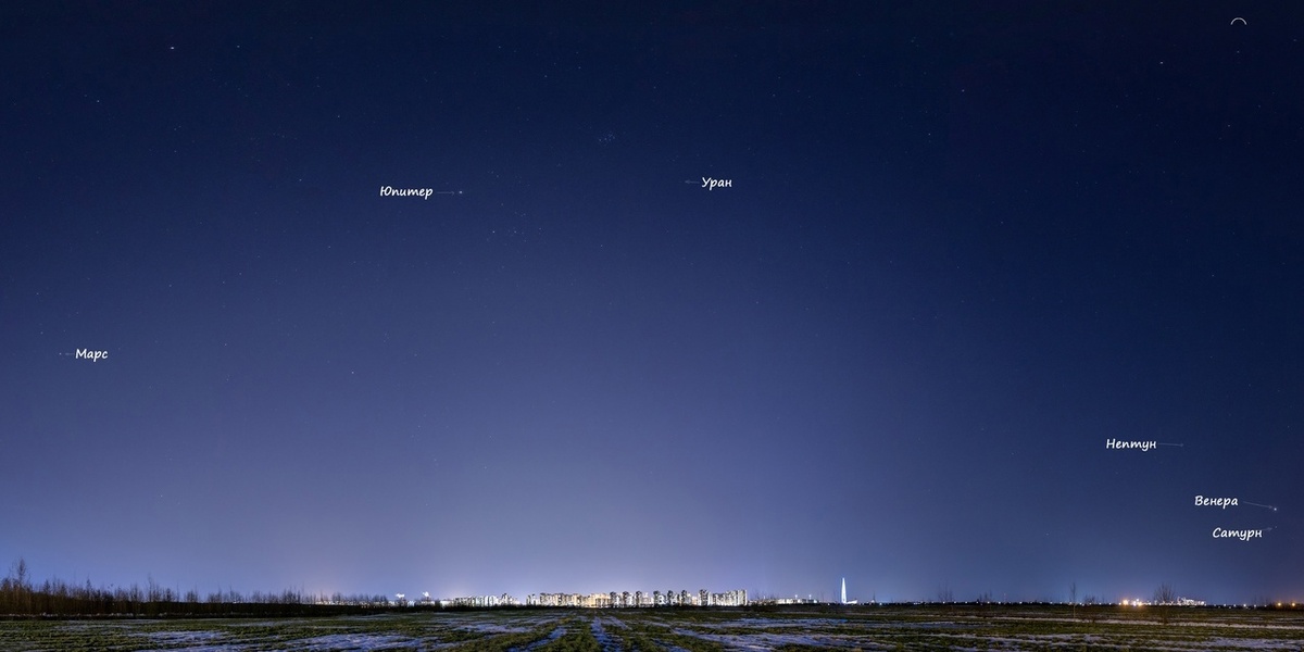 Парад протяженный, от восточной до западной части неба. В нем принимают участие Марс, Юпитер, Уран, Нептун, Венера и Сатурн. Планеты расположатся вдоль эклиптики (траектории видимого движения Солнца по небу). Невооруженным глазом можно увидеть самые яркие из них — Венеру, Марс, Юпитер и Сатурн. На ясном небе они будут хорошо различимы. Уран и Нептун — более удаленные планеты, и чтобы рассмотреть их, понадобится телескоп или мощный бинокль, но даже с оптикой лучше уехать подальше от городских огней.