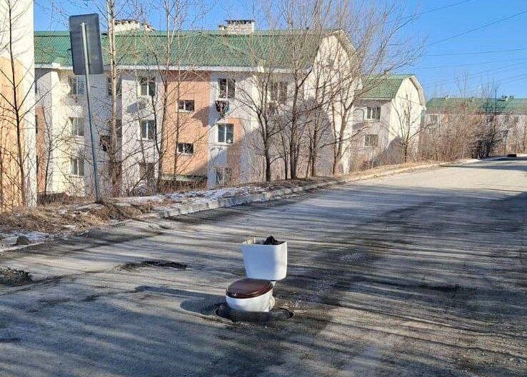 В Приморском Артёме местные жители решили, что если коммунальные службы не могут справиться с открытым люком на дороге — они справятся сами. Так прямо посреди улицы появился необычный арт-объект — унитаз.