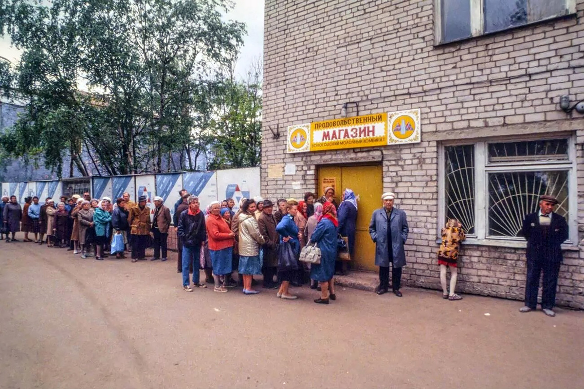 Очередь в магазин Вологодского молочного комбината на Пошехонском шоссе, 1992 год. Торговая точка закрыта на обед, что сейчас не особо уже и встретишь.