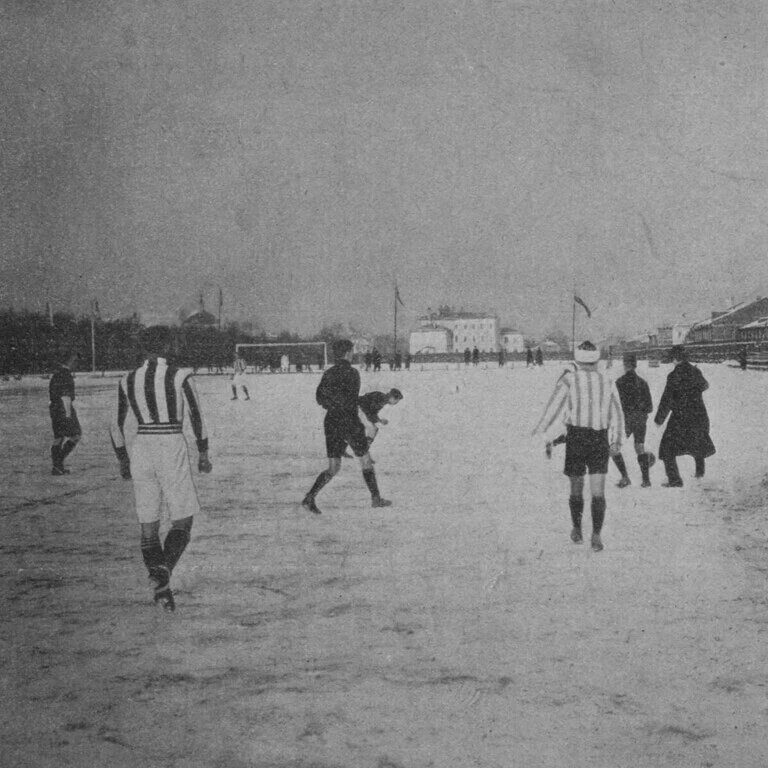 Погода сегодня — так себе. Совсем не зимняя. Поэтому мы решили погрузиться в историю московского спорта. А именно — футбола.