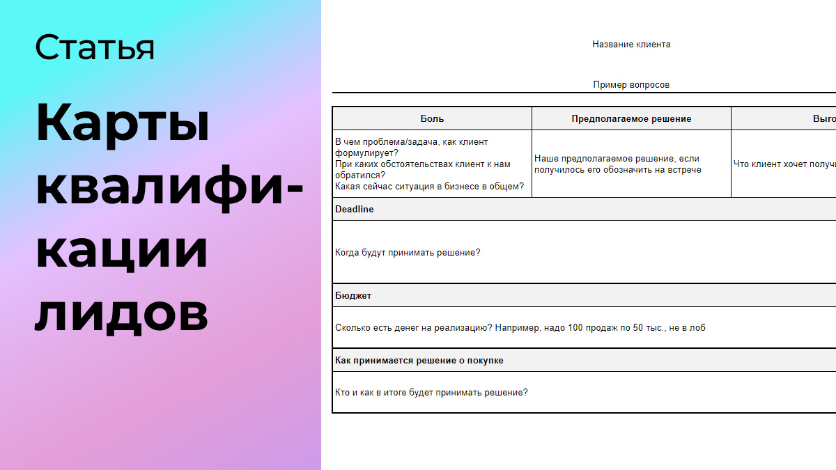 Если вы в бизнесе часто сталкиваетесь с ситуацией, когда интерес к продукту или услуге не заканчивается покупкой, например, клиент ушел, потому что дорого, выбрал другого подрядчика или просто пропал, то эта статья для вас. Более 5 лет я работаю на позиции руководителя маркетингового производства в топовом агентстве IT-Agency. И точно знаю, что для маркетингового агентства каждая сделка имеет большое значение. Ведь на привлечение целевого лида было потрачено кучу времени, сил и средств. А простои в работе команды всегда = убытки для агентства. Давайте расскажу, как у нас, в IT-Agency, Рома внедрил карту квалификации лидов и как это помогло увеличить количество клиентов, которые из целевых стали квалифицированными. Больше полезных материалов можно найти в моём блоге. В нём я регулярно делюсь бесплатными шаблонами и инструкциями, которые существенно облегчают жизнь маркетолога. А ещё больше интересного в моём Телеграм. Подписывайтесь! Прежде всего, стоит обозначит, что: Карта квалификац