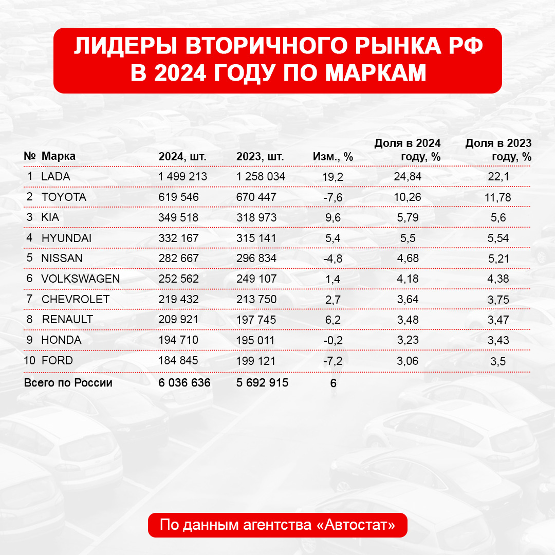 Вторичный рынок РФ в 2024 году вырос на 6%, самые популярные марки — Toyota и Kia. После Лады, конечно 😉