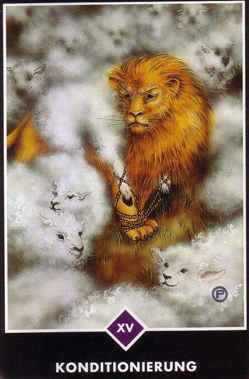 Обуславливание (Дьявол) Пока вы не отбросите свою личность, вы не сможете найти свою индивидуальность. Индивидуальность дана существованием, личность навязана обществом. Личность удобна в социуме. Общество не может быть терпимо к индивидуальности, потому что индивидуальность не будет подчиняться как овца. У индивидуальности есть качество льва, лев двигается в одиночку. Овца всегда в толпе, надеясь, что в толпе она будет чувствовать себя уютно. В толпе человек чувствует себя более защищенным, уверенным. Если кто-то нападает, в толпе больше шансов спастись. Но одному? Только львы двигаются в одиночку. Каждый из нас рожден львом, но общество программирует наш ум, воспитывая из нас овец. Это даст вам личность, уютную личность, приятную, очень удобную, очень послушную. Общество хочет рабов, а не людей, которые посвятили себя свободе. Обществу нужны рабы, потому что государственные интересы требуют покорности. Эта карта обращается к старой притче Дзен о том, как овца вырастила львенка, и он