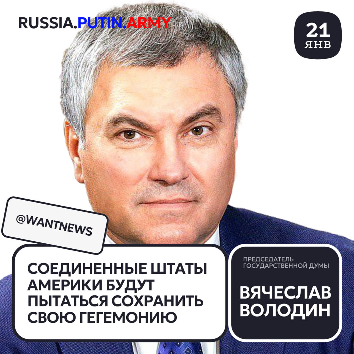🔈 Об этом Председатель Государственной Думы заявил в ходе пленарного заседания 21 января 🗣️ «Соединенные Штаты Америки будут пытаться сохранить свою гегемонию. Мы уже сейчас видим: вчера они вывели Кубу из [списка] стран-террористов, сегодня вновь включили. Вчера они боролись за однополые браки и меняли пол, навязывали эту политику всей Европе, а сегодня говорят — нет, возвращайте пол», – сказал Вячеслав Володин. 😅 Он добавил, что, кроме того, США ранее активно продвигали климатическую повестку, а сегодня вышли из Парижского соглашения по климату, а также из ВОЗ, которую ранее создали. «В этом опять их корысть, – отметил Вячеслав Володин. — Опять ищут себе выгоду, потому что практически обанкротили всех, используя инструмент платежной системы доллара, сделав из этого политический рычаг, и используя шантаж». 😅 По словам Председателя ГД, это еще раз демонстрирует то, что «заложниками политики Вашингтона могут оказаться многие страны, которые делали все, что Вашингтон говорил». «Нам н