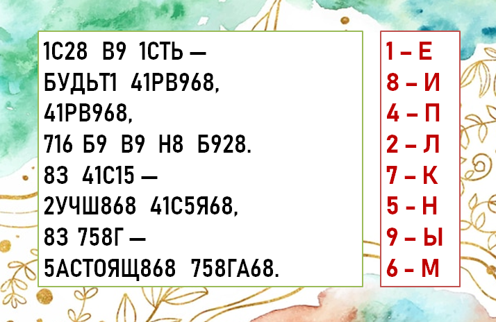Задача очень простая. Необходимо прочитать отрывок стихотворения, заменив цифры на буквы. Подсказка будет справа от текста.