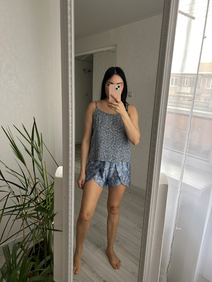 Вот так вышло и в этот раз. Сестра сшила себе сарафан и отдала отставок мне. Отрез был приличной величины. Я сшила себе рубашку, а остаток пустила на топ для сна. У меня как раз лежат шорты, которые тоже шила из остатков. Так у меня получился комплект для сна из топа и шорт.