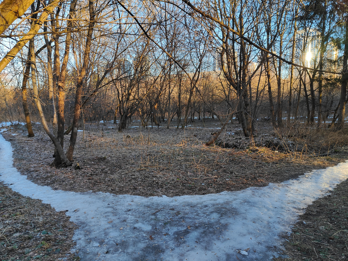 Вопрос несмешной. Конечно, большинство людей рады мягкой зиме. Можно не кутаться в теплую одежду, можно больше времени проводить на улице. Но вот садоводы переживают. Как бы не ударили морозы по бесснежью! Или того хуже - как бы не получился перевёртыш: не нагрянул бы январь в апреле! Но переживай - не переживай, а повлиять на погоду мы не можем. Можем только наблюдать. И пользоваться моментом: тепло же и даже солнечно. Типичная апрельская погода. Мы решили воспользоваться погодным подарком и прогуляться на природе. Ближайший к дому "зелёный оазис" - природный заказник "Долина реки Сетунь". Удивились, что очень много народу гуляет по центральной дорожке, просто небывало много. Но мы-то любим ходить тропами, сквозь "лесок". Пошли по обычному маршруту и быстро поняли, почему так много людей делают променад по той дорожке. Потому что ни по какой другой дорожке или тропинке пройти нельзя - везде сплошной лёд! За зиму гуляющие утоптали снег, а солнце сверху отполировало его до состояния л