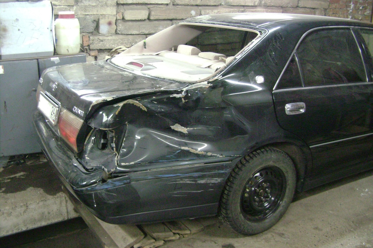 Toyota Crown в 170-ом кузове. Попал, бедолага, под автобус :( Попал довольно жестко. Геометрия задка была нарушена: задняя часть съехала влево, правый задний лонжерон ушел вниз. Предварительно была восстановлена геометрия задницы, лонжерон я поставил на место. Заменил заднее правое крыло, крышку багажника, задний бампер. Ремонтировались задняя панель кузова и правая задняя внутренняя арка. Вклеено новое стекло со старым молдингом. И он стал Краун лучше нового! Шильдики на крышку багажника не стал клеить по желанию клиента. Иногда бывает так, что в мой гараж заглядывают почти новые автомобили. Вот, например, на момент ремонта годовалый Mitsubishi Galant, ещё на гарантии. Хозяина машины замордовали дилер и страховая, решили его использовать в качестве волейбольного мяча в своей игре под названием "Согласование стоимости ремонта". Когда ему эта игра надоела, он плюнул, взял денег сколько дала с