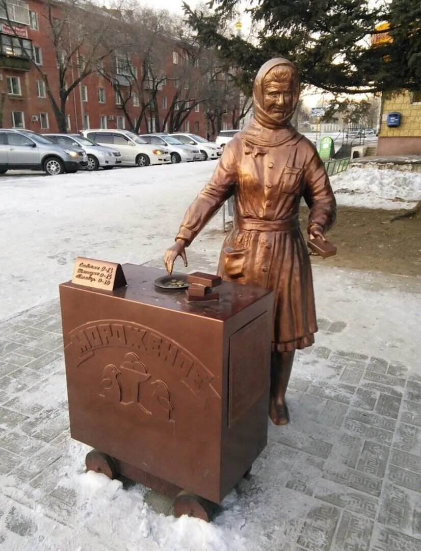 Путешествуя по странам, городам и весям, мы часто обращали внимание на памятники, установленные на добровольные пожертвования людей. В знак благодарности тем людям, от которых их жизнь стала ярче и счастливее. Сегодня мы расскажем об одном таком… В городе Благовещенск напротив городского театра Драмы установлена необычная бронзовая скульптура. Она посвящена женщине - легенде советского детства нескольких поколений жителей города — Зинаиде Дмитриевне Синицыной. Двадцать лет эта неприметная женщина продавала эскимо на одной и той же остановке у театра Драмы, встречая людей доброй улыбкой.