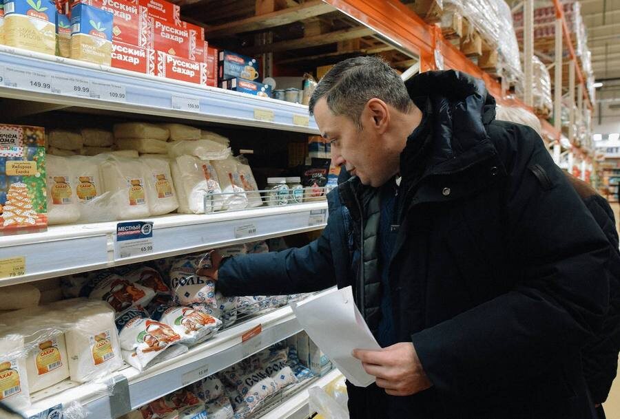 После того, как куряне раскритиковали заявление врио замгубернатора Сергея Стародубцева о снижении цен на 12 наименований социально значимых продуктов, Александр Хинштейн решил прокатиться по магазинам. И сегодня врио губернатора побывал в трех сетевых магазинах, сравнил цены в отчетах и на ценниках в торговых залах. Забегая вперед, скажем, что совпали они не везде. Напомним, в прошлый понедельник на заседании правительства врио замгубернатора Сергей Стародубцев привел данные Курскстата, судя по которым было зафиксировано снижение цен 12 социально значимых продуктов из 24. Речь в докладе Стародубцева шла о картофеле, колбасе, маргарине, масле подсолнечном, молоке, рисе, свинине, соли поваренной, сосисках, сардельках, твороге и черном чае. «После заседания получил в соцсетях немало критических отзывов курян, где они предлагали проверить мне цены лично, не доверяясь докладам чиновников», — рассказал Хинштейн. Он побывал сначала в «Линии». «На ряд товаров цены, действительно, снизились. С