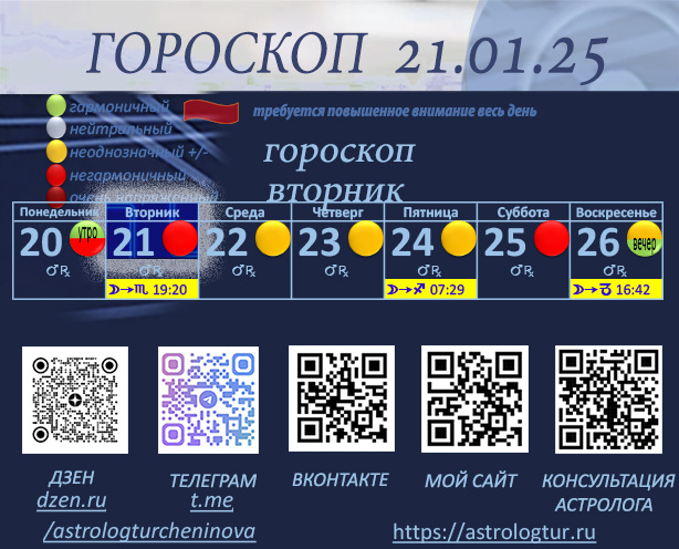 Очень напряженный день. Сегодня Солнце соединяется с Плутоном. Помимо этого, остальные аспекты дня также напряженные. Самое лучшее в такой день - это соблюдать правила безопасности, быть осторожным, не вступать в конфликты, не учувствовать в массовых мероприятиях. Этот момент подобен глубокому погружению в собственную суть, где происходит радикальная переоценка жизненных установок. Человек получает мощный импульс к трансформации, способность и возможность отсекать все лишнее, и фокусироваться на действительно важном. (Влияние аспекта Солнце соединение Плутон минимум с 19 по 25 января). Это очень сильный аспект, и если его энергию направить в "правильное русло", то можно справиться с любой задачей, достичь желаемого. Но как это часто бывает, есть и "обратная сторона медали" - напряженное влияние. Если не быть осторожным, неправильно рассчитать энергию, такой аспект может привести к разрушениям, саморазрушению. Солнце - Плутон, минусы: - в эмоциональном плане может проявляться как: упр