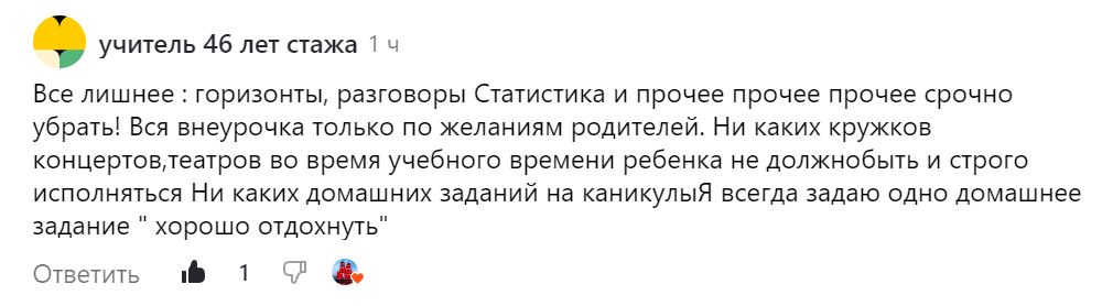 Последний пост был про новые предложения для школы. Некоторые предложения неплохие, но требуют доработки и конкретики. Вот ссылка. Если не успели прочитать, вам сюда. Оставайтесь на связи- И читатели, понятное дело, стали выражать свои мнения по поводу этих бесконечных нововведений. Думаю, что вопрос снижения нагрузки на школьников будет ещё долго оставаться в поле зрения чиновников, потому как что-то делать надо, но что? Обсудим варианты)) Здесь риторический вопрос и пауза. Было предложение уменьшить уроки до 30 минут, чтобы успевать внедрять все хотелки. Это коварное предложение, если задуматься, не по тому пути предлагаете идти, но может быть это был сарказм от читателя? Так мы договоримся вообще до массового сокращения всего в пользу развлечений в школе. Но при всём при том, учитель программу выдай и результат покажи, будь добр. А мы уж с этим разберёмся. Разбираться- это не работать каждый день с мелом у доски и вкладывать знания в головы учеников. Тех, кто хотят эти знани