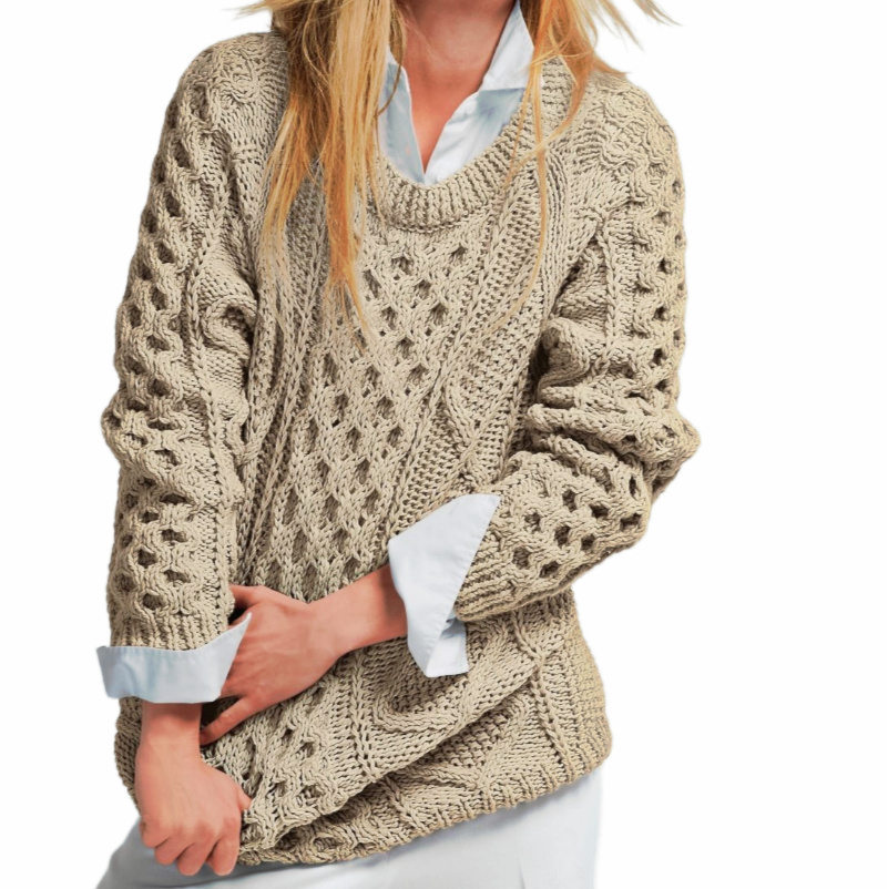 Ажурный коричневый пуловер-наволочка с поэтичным названием Hedda. К сожалению, не нашла бесплатного русского перевода. Но модель довольно простая в исполнении, а у нас есть схемы узоров и выкройка — что ещё нужно?