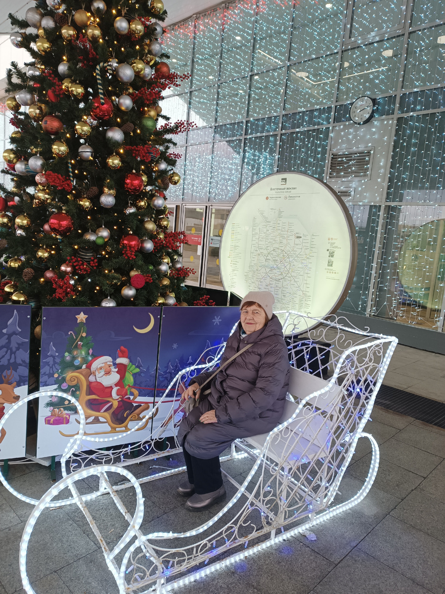 19 января 2025 года Здравствуйте, друзья! Вчерашний субботний день я провела на Восточном вокзале и в его окрестностях. Так получилось. Дело в том, что ко мне в гости приехала подруга из Тверской области. Но не совсем в гости. Она провожала свою сестру на поезд, отправляющийся в Белгородскую область как раз с Восточного вокзала. Ну и осталась у меня на воскресенье погулять по Москве. Восточный вокзал совсем новый, года три ему. Новогоднюю иллюминацию ещё не зачехлили, у входа стоит ёлочка, рядом с ней новогодние сани, в которых можно посидеть и сфотографироваться. Внутри вокзал не особо интересен, но камера хранения имеется. В эту самую камеру мы положили три сумки нашей будущей пассажирки, и пошли обозревать окрестности. На самом вокзале делать было нечего, одно кафе со стоячими столиками и невнятным ассортиментом и ни одного магазина или хоть киоска с сувенирами. Обошли здание вокзала вокруг и напротив, через дорогу, увидели здание Торгового Центра, кажется он называется Новочеркизо