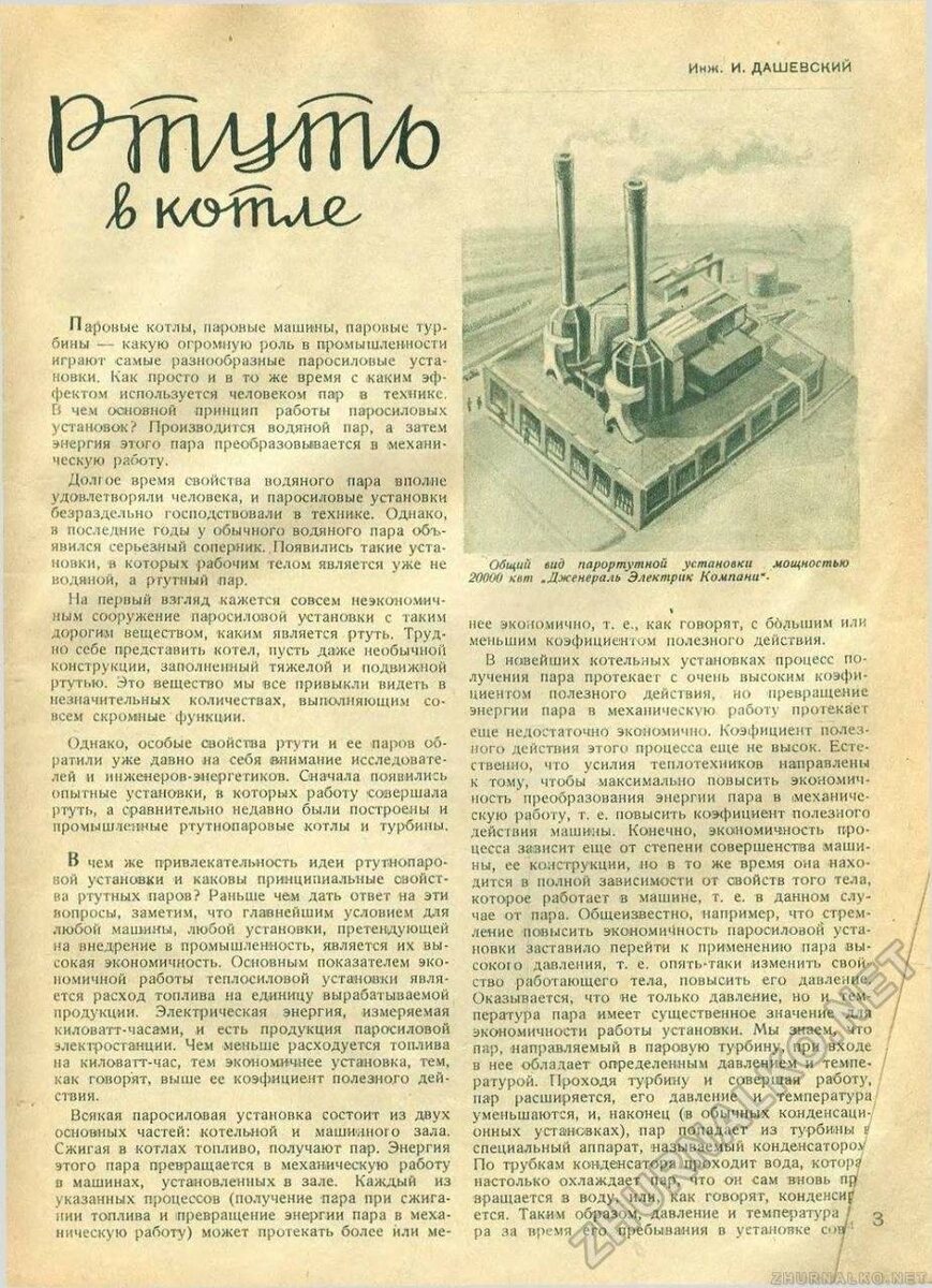 В журнале «Техника молодежи» №10 за 1936 год была напечатана интересная статья об одной уникальной технологии начала ХХ века, основанной на использовании ртути, вещества, подлинные свойства которого от нас умышленно скрываются. Название этой статьи — «Ртуть в котле» и написана она инженером И. Дашевским. А для того, чтобы вы могли понять принцип действия этой технологии, привожу эту статью полностью.