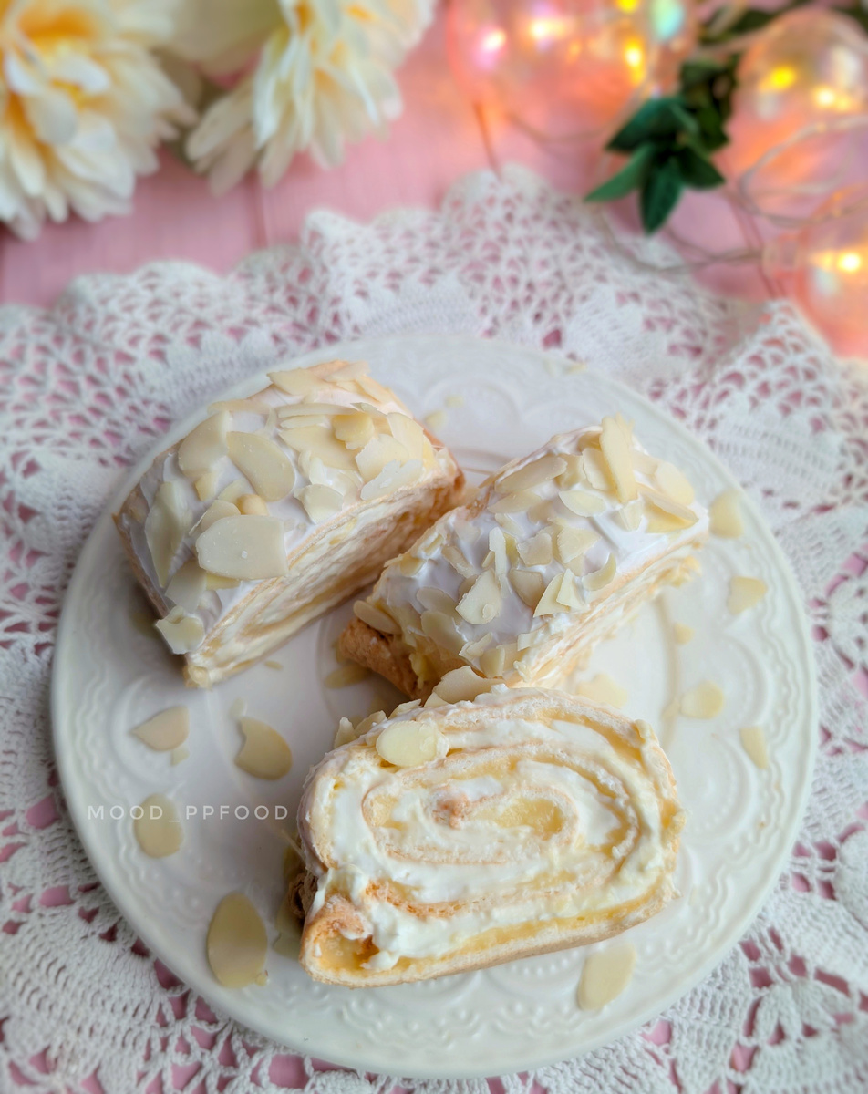 ▫️Для апельсинового курда: Апельсиновый сок - 180 г. (Примерно от двух апельсинок) Крахмал кукурузный - 10 г. Желток яичный - 1 шт. Масло сливочное - 10 г. Подсластитель - 3 г. ▫️Для основы: Яичный белок - 3 шт., или 70 г. пастеризованного из бутылочки + белок от одного яйца. Крахмал кукурузный - 10 г. Подсластитель, у меня Prebiosweet - 10 г. Лимонная кислота - щепотка. ▫️Для крема: Творожный сливочный сыр - 100 г. Творог мягкий 0.1% - 100 г. ▫️Для украшения: Миндальные лепестки по желанию. 1️⃣ В кастрюльку наливаем 180 г. сока, я предварительно выжала его из апельсинов, яичный желток (белок нам тоже скоро пригодится, поэтому далеко не убирайте его), 10 г. кукурузного крахмала и подсластитель, у меня 3 г. Prebiosweet. Всё хорошенько перемешиваем, чтобы не было комочков. 2️⃣ Ставим на плиту, на средний огонь и постоянно помешивая, доводим смесь до загустения. 3️⃣ Выключаем плиту, добавляем 10 г. сливочного масла и перешиваем, чтобы оно полностью растворилось. 4️⃣ Перекладываем наш