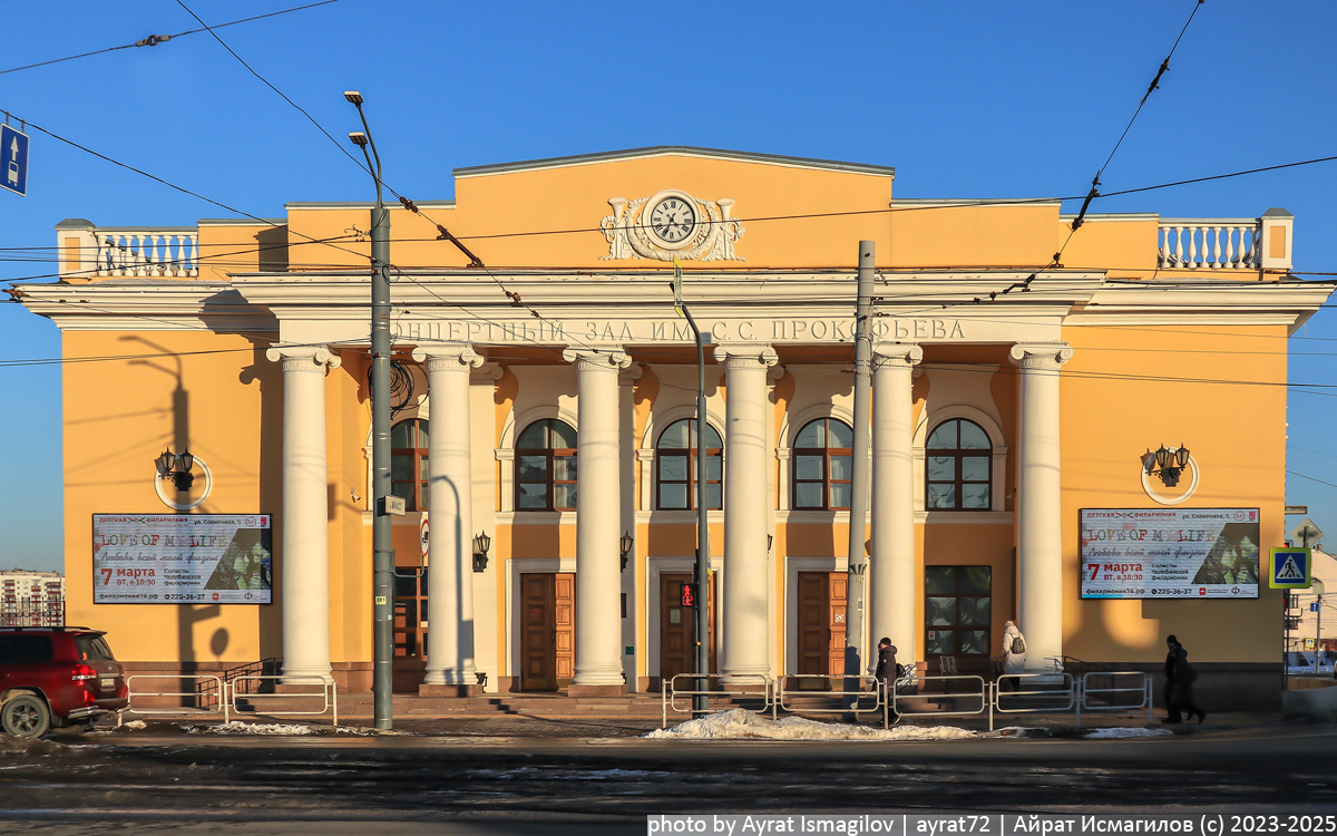 В окончании челябинской пешеходки, представляющей из себя участок улицы Кирова протяженностью в три квартала, расположено несколько любопытных зданий в стиле неоклассицизма. На самом берегу Миасса, вблизи моста, - здание концертного зала имени Прокофьева. Современный вид здание обрело в ходе длительной (с 1988 по 2004 годы) реконструкции, и это была третья по счету масштабная переделка. А история здания уходит корнями в конец XIX века. В 1888 году купец Шакир Ахметов приобрел у прежнего хозяина земельный участок на углу Уфимской и Сибирской улиц (сейчас это Кирова и Труда), снес деревянные строения и построил каменное 2-этажное. Вероятнее всего, как это было принято у купцов, первый этаж был отведен под торговые площади, а второй - под жилье. В начале XX века соседний участок по нынешней улице труда купил купец Закир Галеев (да, да, это был район татарских купцов). Галеев строит свой магазин почти в упор со зданием Ахметова. Далее нам информация про второе здание также будет важна. Гла