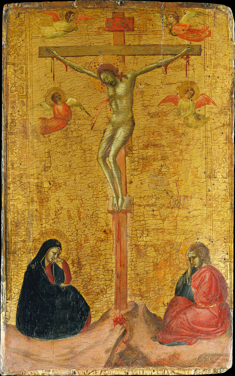 Бернардо Дадди (ок. 1280–1348) был одним из самых важных флорентийских художников первой половины четырнадцатого века. Его видение было сформировано Джотто (1266/67–1337), у которого он, возможно, учился. Его картины сочетают ясность структуры, присущую фресковой живописи, с цветом, похожим на драгоценный камень, и изысканным исполнением миниатюриста. В 1330-х и 1340-х годах его оживленная мастерская производила многочисленные переносные алтари для личного поклонения. И хотя они могут несколько повторяться, все они сделаны на неизменно высоком уровне. Эта картина — одна из створок диптиха, который, несомненно, включал изображение Девы Марии с Младенцем, ныне утраченное, — является одной из самых ранних работ Дадди в стиле Джотто и особенно примечательна сдержанной выразительностью и благородством фигур. Скорбные позы Девы Марии и святого Иоанна, смиренно сидящих на земле, заимствованы у изображений пленников на римских саркофагах. Хотя фигуры Христа и скорбящих ангелов пострадали от в