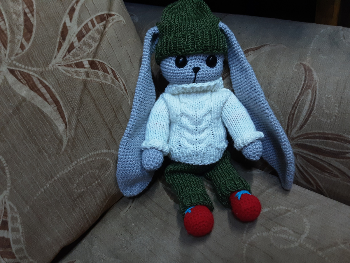 Дорогие друзья! В последнее время у меня накопилось очень много остатков пряжи. Перед Новым годом активно вязала змеек. Сейчас они уже разлетелись не только по разным городам Росии, но и по разным странам. А сейчас увлеклась вязанием зайчиков в одёжке. Представляю вам очередного. Сам зайчик связан из пряжи Пехорка Детская новинка, а одёжка из всех всех остатков.