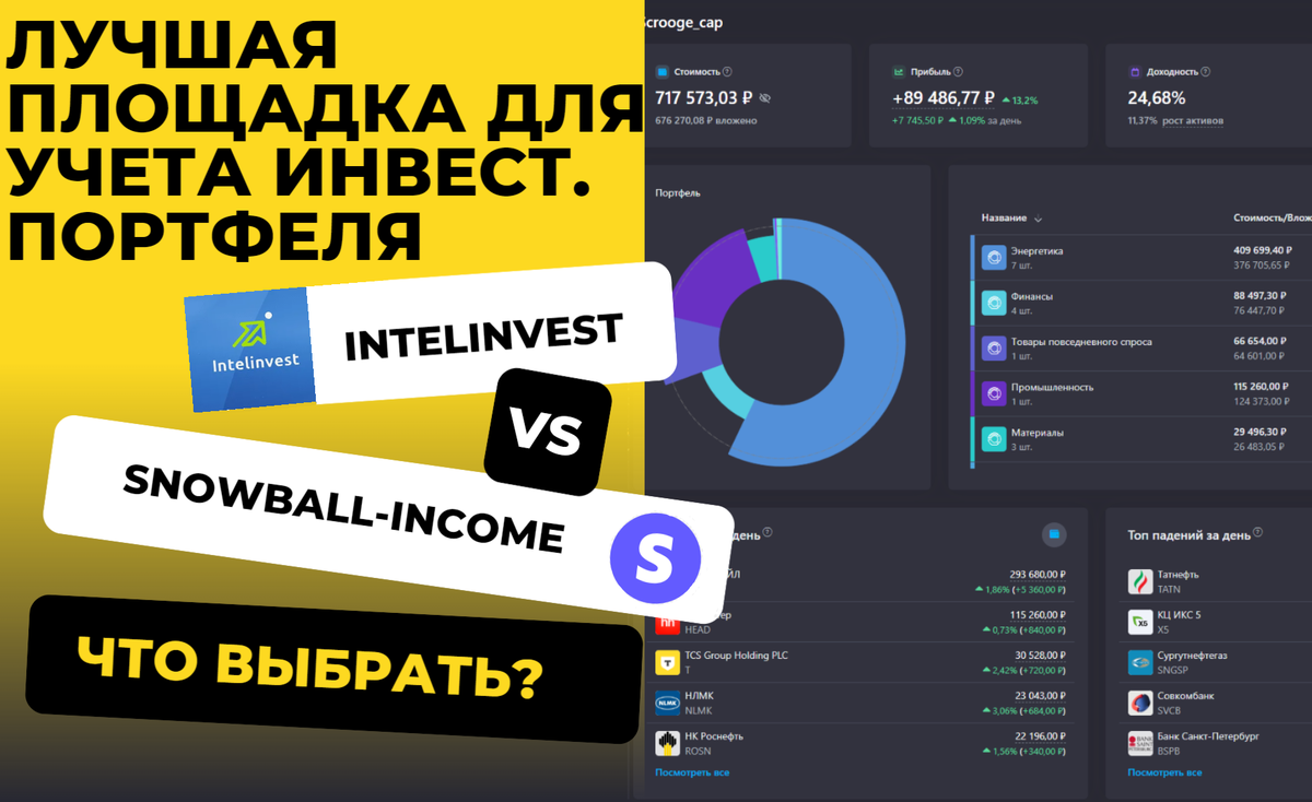 я не буду рассматривать и разбирать на атомы ВСЕ + и - . сумма инвестированная у intelinvest ближе к истине - около 667 тыс.руб стоимость портфеля у intelinvest ближе к истине - 711 тыс. руб 2. Разбор дивидендов , более точный и детальный у snowball суммарно за год у intelinvest - 66 890,07 тыс.руб (не учтены X5) суммарно за год у snowball - 93 982,62.руб + более расширенная статистика по дивам по факту около 92 774,31руб 3. Статистика по активам Тут +/- одинакого 4. Цена подписки Тут ситуация такая на snowball БЕСПЛАТНО можно работать с 10 акциями/обл/пиф и тд компаний , если больше то все блокируется и нужно увеличивать подписку 1месяц - 290 руб У intelinvest такого лимита нет , я работал с 22 разными ценными бумагами и все норм, но если захотите купить 1 мес = 199 руб 5 Цель и помощь в коррекции портфеля snowball в выигрыше, у intelinvest не заметил вообще его 6 Подведение Итогов за год тут +/- статистика одинаковая , но картинка визуально лучше у intelinvest(можно т