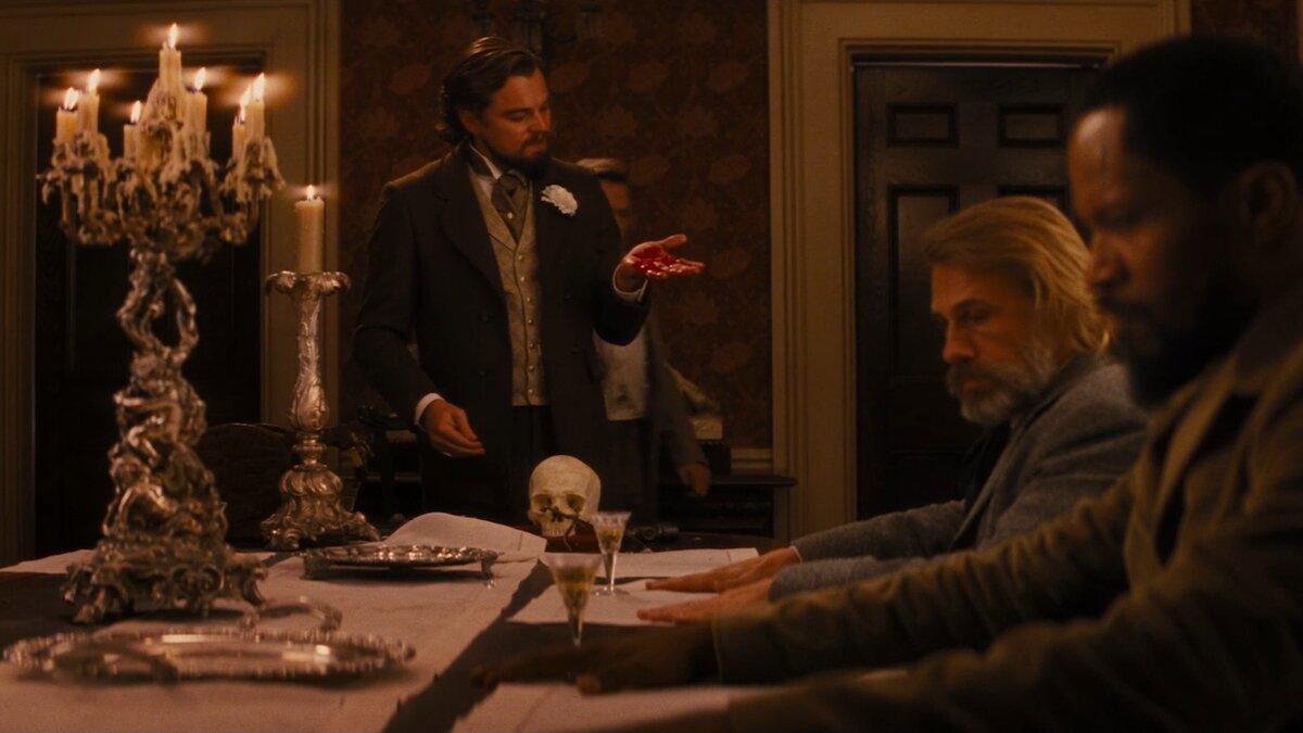 Леонардо Ди Каприо исполнил Кэлвина Кэнди, и думаю, если не все из вас, то многие слышали о таком факте. Во время съёмки этой сцены (на кадре сверху) Ди Каприо действительно получил травму руки. Когда он ударил рукой по столу, то разбил маленький стакан, но, к изумлению других актёров, не выключился и продолжил играть. Кровь в этот момент была настоящей, и можно заметить, как он вытаскивает кусок стекла из руки. После съёмки все ему аплодировали за этот блестящий отыгрыш. Однако, стоит отметить, что о лицо актрисы Керри Вашингтон Лео вытирал само собой фальшивую кровь. Кстати, это не единственная его травма, связанная с фильмом. Первую травму он получил ещё на репетиции во время работы с молотком. Просто он отломался и ударил его по голове. На съёмках после этого использовали молоток, сделанный из пены.