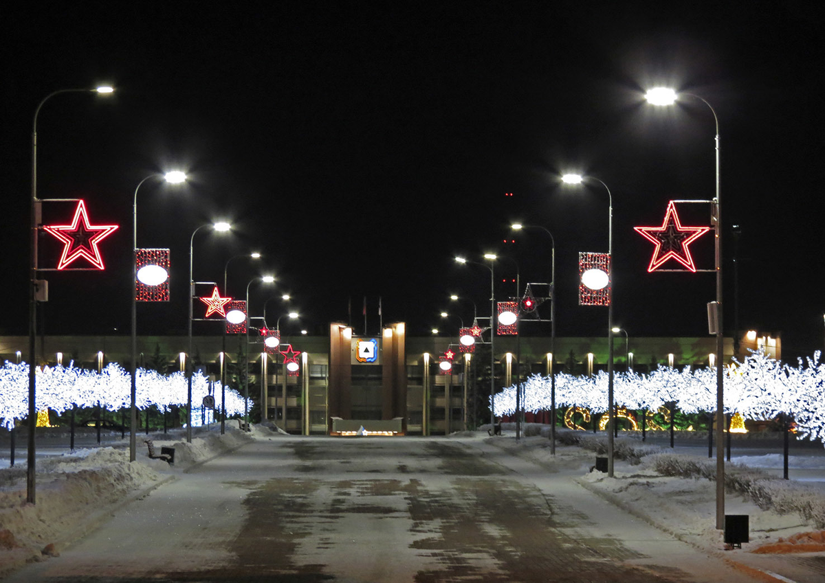Как и многие индустриальные гиганты, Магнитогорск - это город "с ползучим центром". В 1950-х таковой переместился с Левого берега на Правый, а в конце столетия переполз вниз вдоль реки, от Центрального к Южному переходу, из сталинских в позднесоветские районы. Центральной в нынешнем городе можно считать оформившуюся в 1979 году, к 50-летию основания Магнитки, площадь Народных Гуляний с курантами, близ которых ставят и новогоднюю ёлку. На ней же - мэрия с двумя фасадами, глядящими на Урал. Только к площади Народных Гуляний обращён тот, что глядит на Уральские горы, а к площади Торжеств с обратной стороны - тот, что глядит на Урал-реку. На его фасаде - герб с географическим знаком железа: А к реке спускается огромный, километра полтора длиной, Парк Победы, куда уже в ночи, так как днём времени не оставалось, и решила выбраться часть нашей группы. Я присоединился к ним - странным образом в прошлые приезды я не заснял (а лишь запомнил, увидев с проспекта Ленина) символ Магнитогорск - мону
