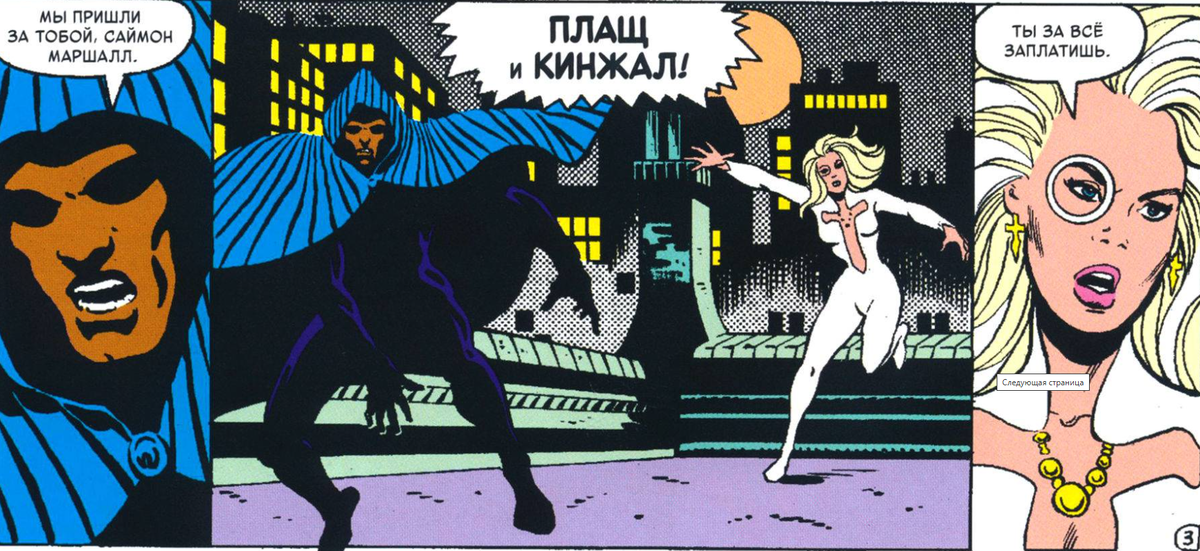 Это «Потрясающий Человек-Паук #64». Некто по имени Саймон Маршалл попросил Человека-Паука помочь ему в стиле «я всё осознал, я готов дать показания, я творил дичь, защити!», когда появились Плащ и Кинжал «твои раскаяния ничего не стоят, потому ты помрёшь». Что характерно, Маршалл на самом деле помер от кинжалов Кинжала, поразивших внутренние органы.