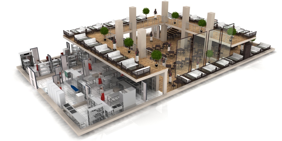 Площадь производственных помещений определяется в зависимости от типа заведения, его мощности и количества мест для посетителей. Обычно такие помещения располагаются на наземных этажах, чтобы обеспечить достаточное естественное освещение. Согласно санитарным нормам, на одного работающего должно приходиться не менее 5,5 квадратных метров, а высота помещений должна составлять не менее 3–3,3 метра.