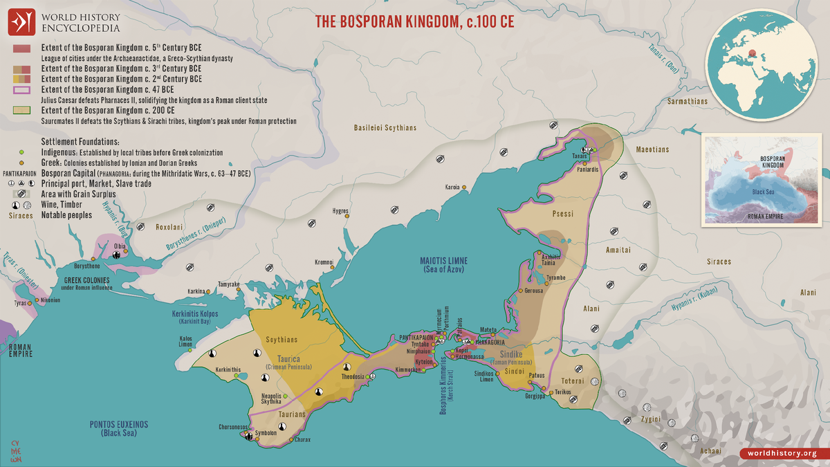 Эта карта иллюстрирует подъём и развитие Боспорского царства (около 480 года до н. э. – 341 год н. э.), древнего государства, расположенного вокруг Боспорского пролива (Керченский пролив), охватывающего части восточного Крыма и Таманского полуострова. Основанное греческими колонистами государство стало процветающим центром торговли Черного моря, экспортируя зерно, рыбу, древесину и рабов, в то время как импортировало специи, предметы роскоши, керамику и металлы. Изначально управляемое греческими династиями, оно стало римским клиентским государством в 1 веке до н. э., процветая под защитой Рима. Боспорское царство было культурным перекрестком, сочетая греческие, скифские и сарматские влияния, прежде чем начался его упадок из-за нашествий гуннов и других кочевых племен.