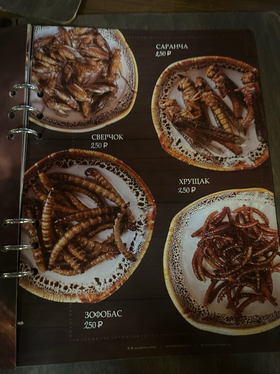 А еще саранчу, сверчков и зофобас? По данным на 2024 год в Москве более 22 тысяч ресторанов и кафе. Для понимания этого количества, представьте, что если каждый день есть в разном, понадобится больше 60 лет! И это при условии, что больше ничего не откроется. Но несмотря на все многообразие и разносторонность, найти откровенную экзотику не так просто. Например, традиционных азиатских закусок, подобных тем, что на фото, в Москве можно достать только «по блату» и по тесному знакомству с вьетнамцами или китайцами. Всему виной закон, по которому насекомые запрещены на кухнях общепита. Меня сложно назвать фанатом этого лакомства, но точно могу сказать, что пару раз накануне Хэллоуина задавалась вопросом, где достать эти «вишенки на торте». Сегодня отойду от традиционных тем, посвященных искусству и расскажу про поездку в Подмосковную Коломну. Место, где искушенному гедонисту предложат бургер из улиток, стейк и уху из крокодила и куриное яйцо с икрой улитки. Экодеревушка расположена всег