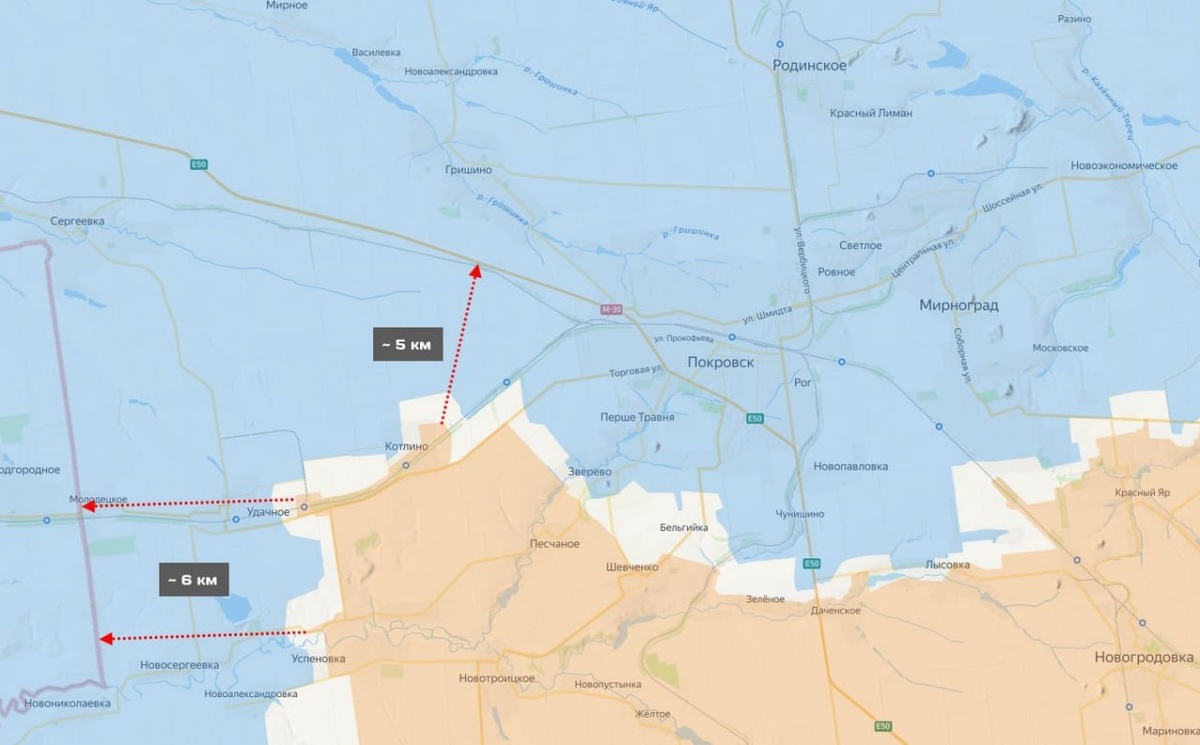 После перерезания трассы, связывающей Красноармейск (Покровск) с Днепропетровской областью, которая уже под огневым контролем, ВС РФ сделают бросок на север к Гришино, как в годы Великой Отечественной войны. Об этом на канале «Альфа медиа» заявил рядовой ВСУ с позывным «Историк», передаёт корреспондент «ПолитНавигатора». «Они уже до Удачного дошли, по крайней мере, на картах «Дип стейт» это именно так. Вот тебе и всё. Движение далее вверх к перерезанию трассы. По сути, она уже частично под огневым контролем FPV, уже это небезопасный проезд давно. Следующее, я думаю, будет село Гришино. Они займут его по принципу Второй мировой войны, только тогда советские войска шли с севера на юг, а на данный момент движение с юга на север, и опять же, думаю, ключевой точкой будет село Гришино.Достигнув этого рубежа, они сформируют достаточно весомую клешню и будут иметь возможность двигаться через асфальтированную дорогу примерно до Родинского, не доезжая немного до небольшого города. Ну и тогда это