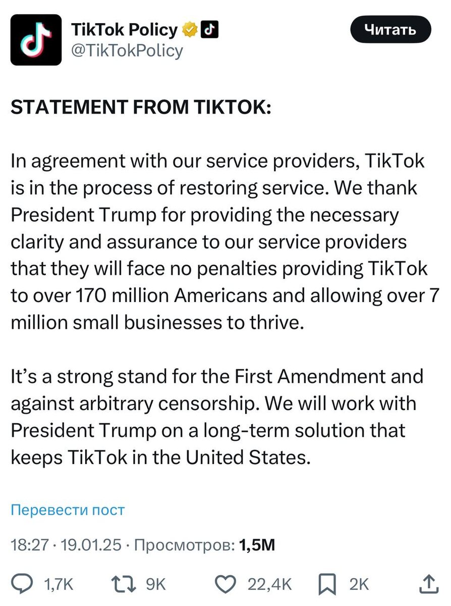 TikTok уже начал восстанавливать работу в США. Руководство площадки поблагодарило Трампа за обещание спасти соцсеть.