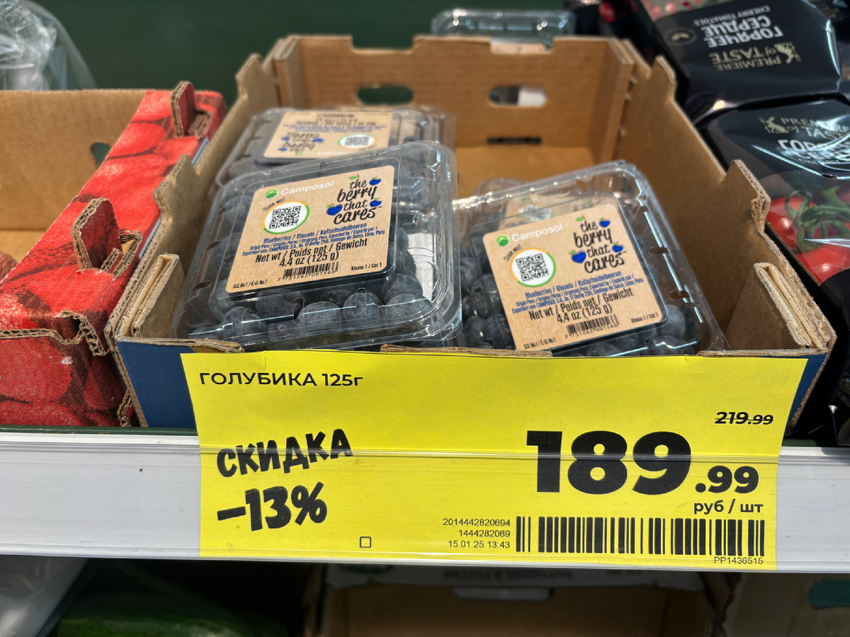 Приветики! Всех православных поздравляю с праздником Крещения Господнего! Мира и благополучия всем нам! Добралась я до Магнита. Похоже, это будет мой первый обзор в этому году из этого магазина, вот это да!!! Сама удивлена. Голубика сегодня была по 189 рублей за 125 грамм. Вроде и дорого, с другой стороны эта ягодка гораздо дороже продавалась в последнее время. Давно не брали. Купила, разорилась так сказать. Делю на два раза коробочку девочкам. Мою голубику, яблоко или другой фрукт. Всё вместе кладу им. Бывает, что и не всё съедают, поэтому, уж 100-150 рублей на фрукты можно иногда выделить в день. Помело мини. 199 рублей за кг. Как интересно! Не видела таких малышей еще. По размеру как крупный апельсин или грейпфрут. Кстати, как-то на днях покупала грейпфрут младшая попробовала и не стала кушать, старшая дочка пару долек съела, мы с мужем съели с удовольствием. Огурцы/помидоры дорогие сейчас. Вот штучные по 115 рублей. На развес длинные огурцы по 276 рублей были. Черри сильно подорож