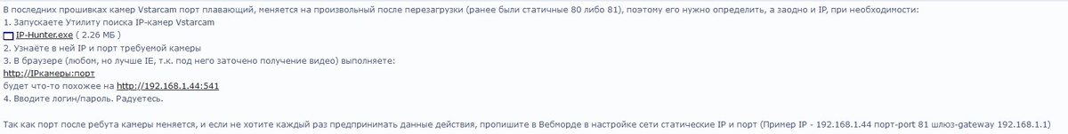 Очень нужно было добавить камеры VSTARCAM в регистратор HIWATCH. В последних прошивках камер Vstarcam порт плавающий, меняется на произвольный после перезагрузки (ранее были статичные 80 либо 81), поэтому его нужно определить, а заодно и IP, при необходимости: 1. Запускаете Утилиту поиска IP-камер Vstarcam Прикрепленный файл IP-Hunter.exe ( 2.26 МБ ) 2. Узнаёте в ней IP и порт требуемой камеры 3. В браузере (любом, но лучше IE, т.к. под него заточено получение видео) выполняете: http://IPкамеры:порт будет что-то похожее на http://192.168.1.44:541 4. Вводите логин/пароль. Радуетесь. Так как порт после ребута камеры меняется, и если не хотите каждый раз предпринимать данные действия, пропишите в Вебморде в настройке сети статические IP и порт (Пример IP - 192.168.1.44 порт-port 81 шлюз-gateway 192.168.1.1) Теперь когда узнали адреса, добавляем в HIWATCH