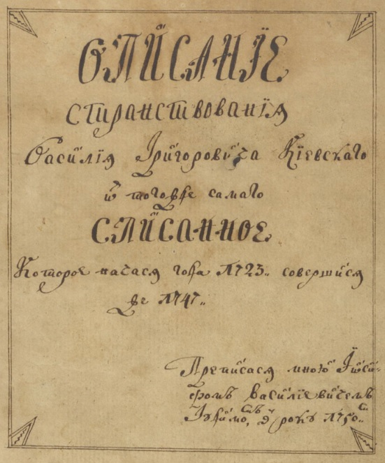 Образ Василия описан его младшим братом, киевским зодчим Иваном, и помещен в предисловии к первому изданию книги: «Портрета сего отца Василия нет, а приметами был он таков: роста высокого, волосы на голове и бороде черные без всякой седины, лицом смугл, телом дороден, брови черные, высокие, большие и почти вместе сошедшиеся, глаза острые, карие, нос короткий; как одеянием, так и произношением речей и осанкою похож был на грека; почему и мать его родная по возвращении его в дом после 24 лет путешествия не могла и чрез час в разговорах узнать; в прочем был нрава веселого и шутливого, любопытен ко всяким наукам и художествам, а наипаче к рисованию, и имел еще с детских лет охоту видеть чужие страны, и что самым делом исполнил»1.